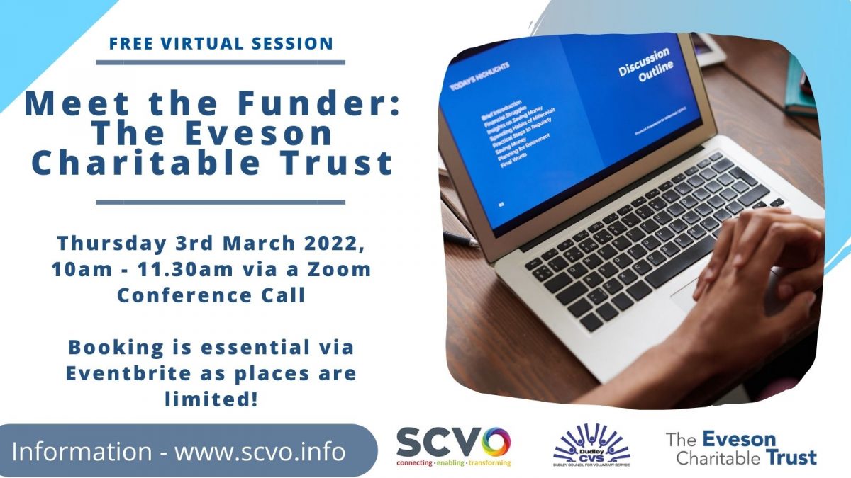 Dudley CVS and our friends SCVO (Sandwell) would like to invite registered charities to our Meet the Funder session with The Eveson Charitable Trust’s Chief Executive, Claire Bowry. Join us on Thursday 3rd March 2022, 10am–11.30am on Zoom to connect …