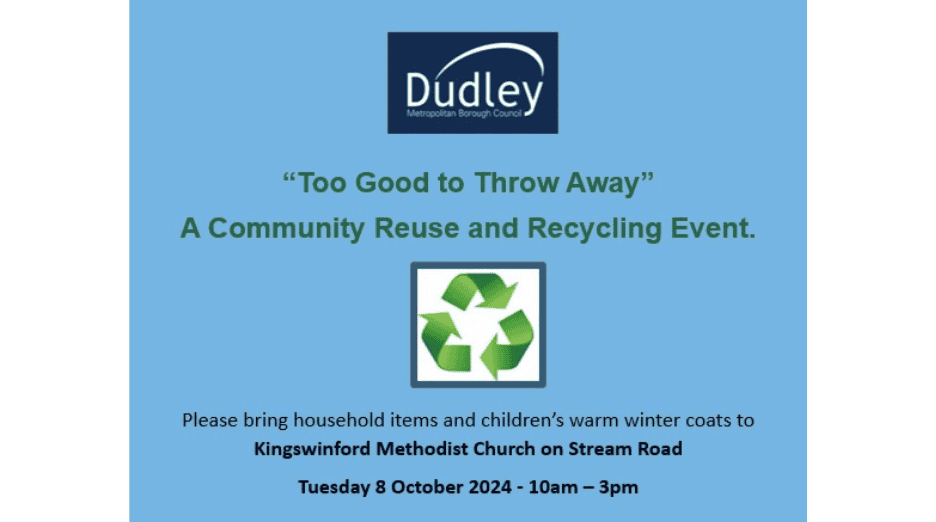 Dudley Council is asking residents with unwanted items to gift them to a community sharing pilot. Dudley Council is holding it’s fourth ‘Too Good to Throw Away’ event at Kingswinford Methodist Church on Stream Road on Tuesday 8th October 10am …